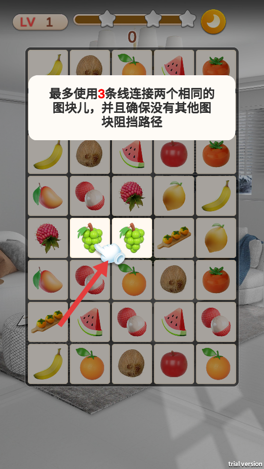 1、進(jìn)入游戲后選擇關(guān)卡,屏幕將呈現(xiàn)滿屏圖案,點(diǎn)擊一個(gè)圖案后,找到相同且連線不超過(guò)三條直線的圖案,點(diǎn)擊即可消除并獲取少量金幣。