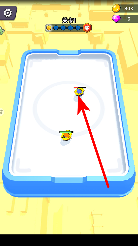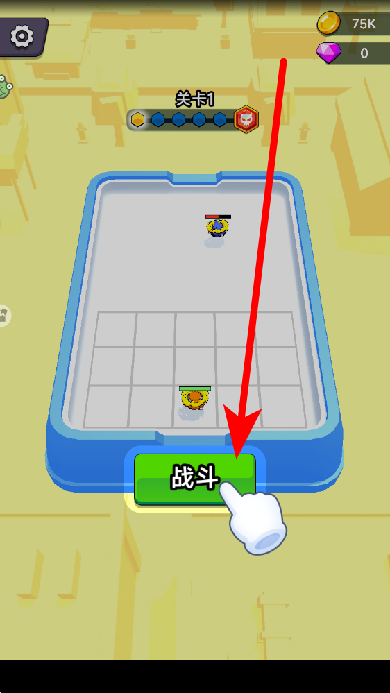 1、進(jìn)入應(yīng)用,在關(guān)卡界面點擊戰(zhàn)斗按鈕,選擇關(guān)卡1開啟挑戰(zhàn),操控己方陀螺,利用場地空間,向敵方陀螺發(fā)起進(jìn)攻,嘗試碰撞擊敗對手。