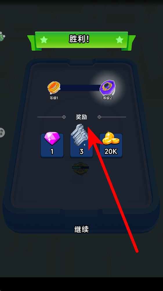 3、戰(zhàn)斗勝利后,進(jìn)入結(jié)算界面,可獲取寶石、道具、金幣等獎勵,點擊繼續(xù)按鈕,返回關(guān)卡選擇,開啟新挑戰(zhàn),用獎勵強(qiáng)化陀螺,提升戰(zhàn)力。