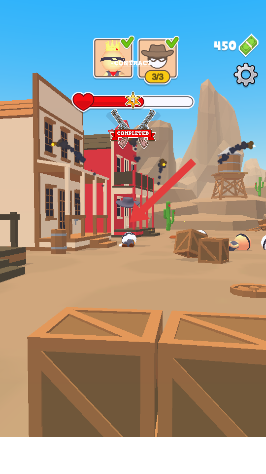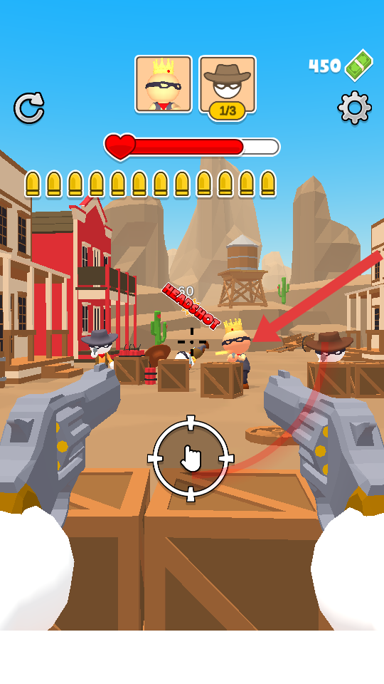 1、進(jìn)入關(guān)卡,懸賞目標(biāo)皇冠、牛仔帽樣式,滑動(dòng)屏幕移動(dòng)雙槍準(zhǔn)星,優(yōu)先瞄準(zhǔn)頭部,觸發(fā)爆頭快速制敵。