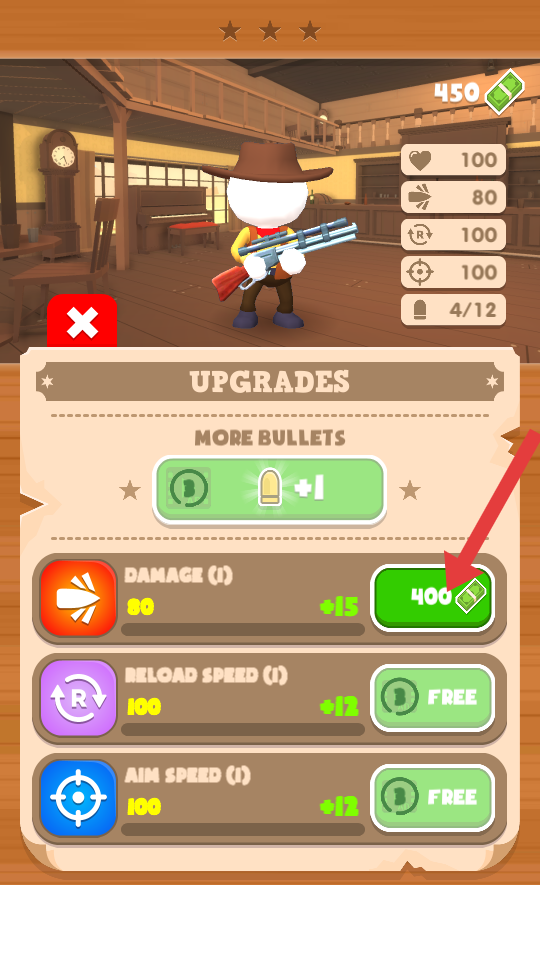 3、通關(guān)后進(jìn)入升級(jí)界面,優(yōu)先用鈔票升DAMAGE傷害提升輸出,選擇換彈、瞄準(zhǔn)速度,強(qiáng)化后繼續(xù)挑戰(zhàn)新關(guān)卡。