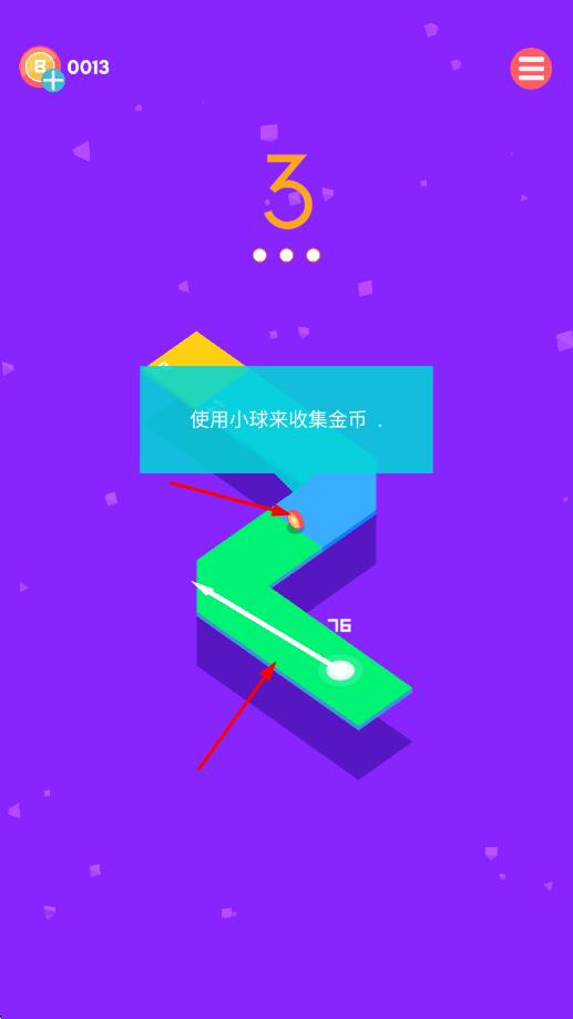 1、第3關(guān)依提示-操控小球沿綠藍(lán)路徑-朝著【紅色金幣】方向-按箭頭指引移動收集。
