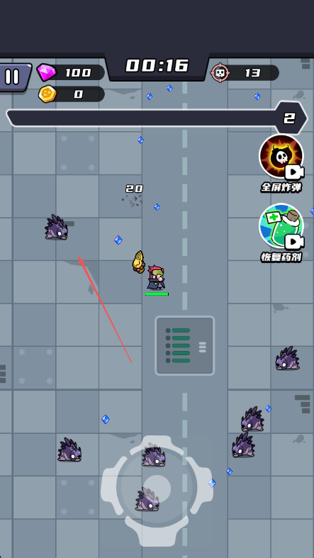 1、進(jìn)入游戲查看屏幕上方00:16倒計(jì)時(shí),操控角色躲避紫色怪物,收集藍(lán)色水晶增加100鉆石數(shù)量。