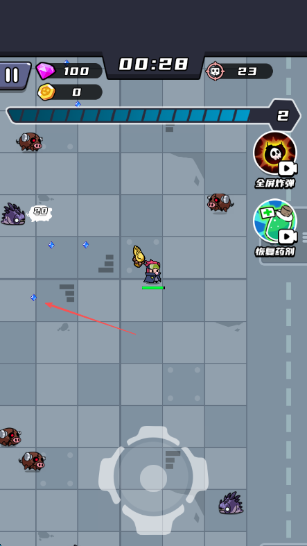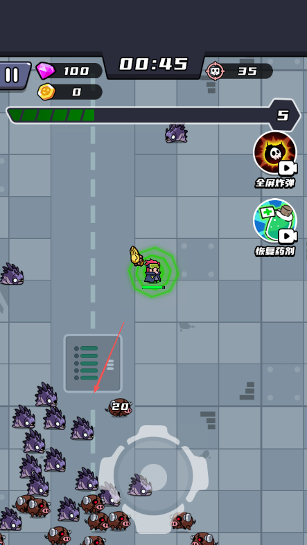 3、倒計(jì)時(shí)到00:45,怪物增多,如被包圍可適時(shí)使用全屏炸彈技能清怪,或用恢復(fù)藥劑回血,堅(jiān)持到時(shí)間結(jié)束完成通關(guān)。