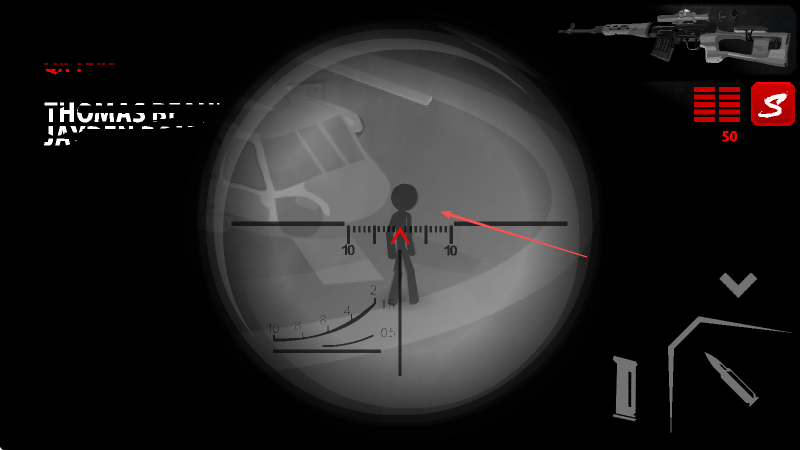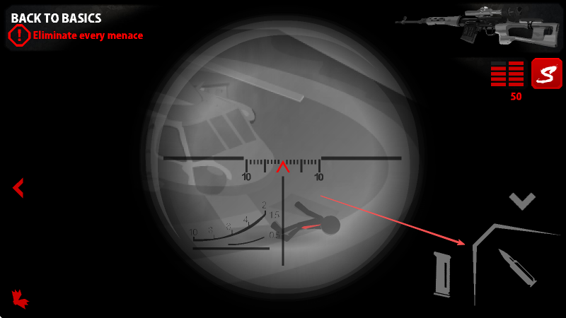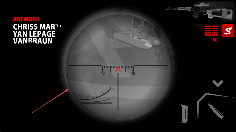 1、進入游戲,觀察狙擊鏡界面,熟悉刻度和標識,留意左上角ARTWORK下方的信息,了解關(guān)卡背景。