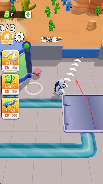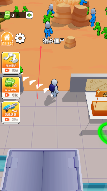 2、在場景中尋找僵尸,發(fā)現(xiàn)后靠近僵尸,準備進行抓捕,同時留意屏幕上方的各種增益選項,如移速提升等。