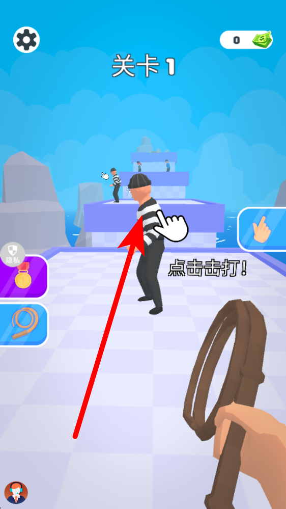1、進入游戲后,在關(guān)卡場景中,看到目標(biāo)角色穿著條紋服裝的角色,根據(jù)提示點擊擊打,對其發(fā)起攻擊,擊敗后可以繼續(xù)前進。