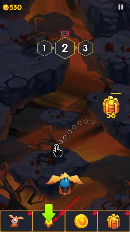 3、在顯示階段數(shù)字(1、2、3)的場景里,點擊下方【火焰】圖標,同時可關注右側【禮物-56】,按指引操作推進關卡。