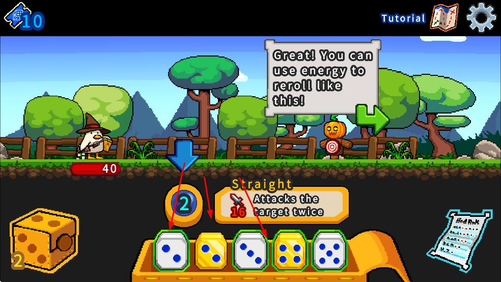 1、學(xué)習(xí)使用能量重擲骰子,了解Straight等技能如攻擊目標(biāo)兩次,為戰(zhàn)斗做準(zhǔn)備。