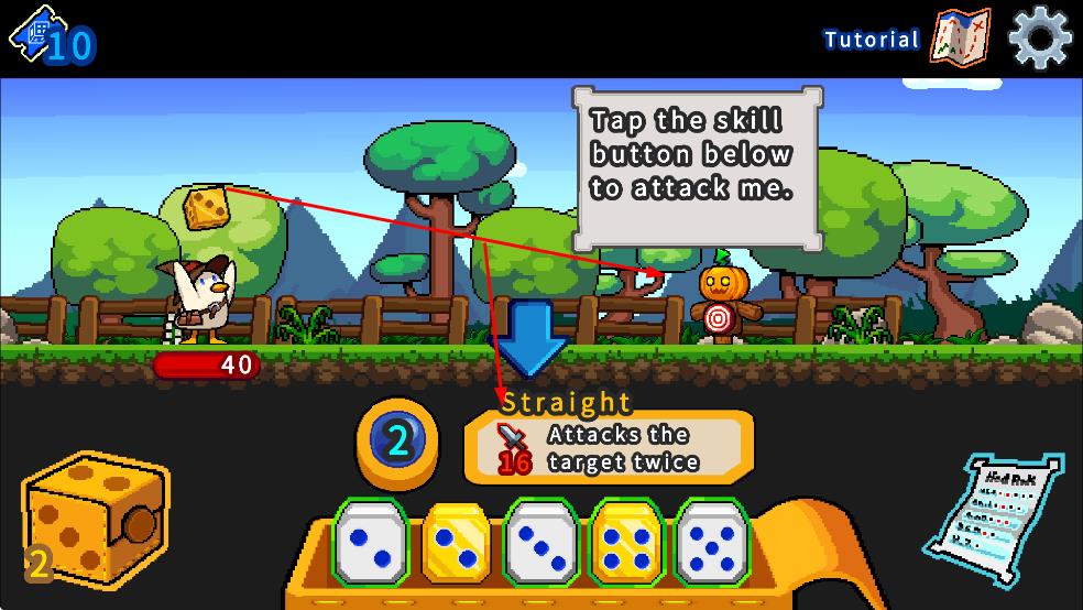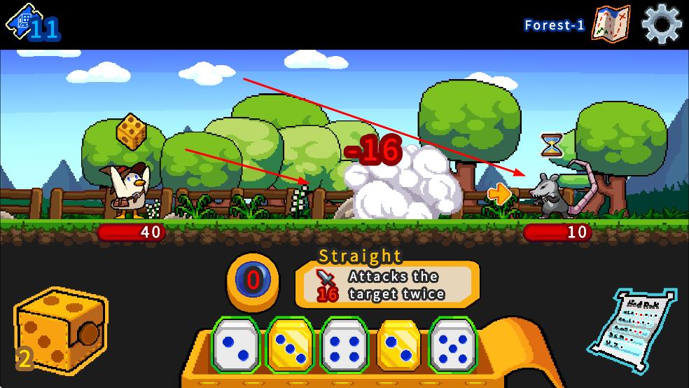 2、點擊下方技能按鈕發(fā)起攻擊,在Forest-1等關(guān)卡中,對戰(zhàn)老鼠等敵人,利用骰子技能造成傷害。