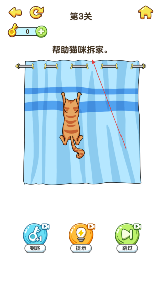 2、觀察場景,點擊屏幕中的窗簾,幫助貓咪把窗簾弄破,完成拆家任務。