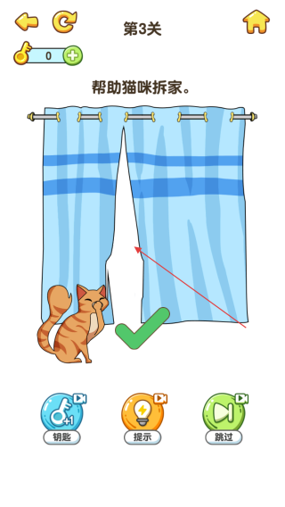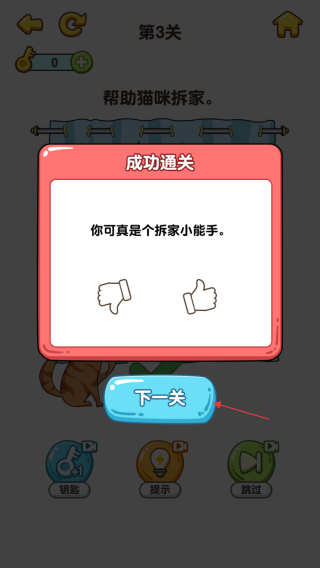 3、當貓咪成功拆家,出現(xiàn)綠色對勾標志后,點擊彈出的下一關按鈕,進入下一個關卡挑戰(zhàn)。