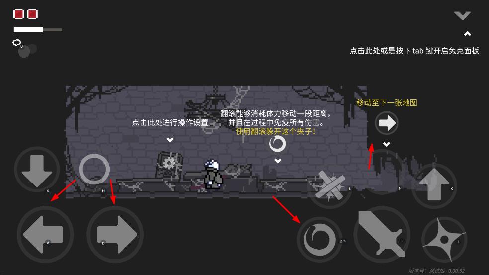 1、用方向鍵控制角色移動,可點擊翻滾按鍵快速移動一段距離,過程中免疫所有傷害,還能切換至下一張地圖探索。