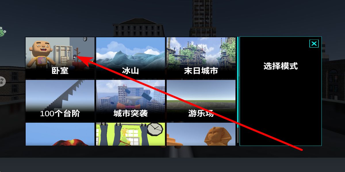 1、新手在模式選擇界面,有臥室、冰山、末日城市等多種地圖可選,根據(jù)喜好挑選心儀地圖,進(jìn)入對(duì)應(yīng)場(chǎng)景,開(kāi)啟城市模擬生存的探索之旅。