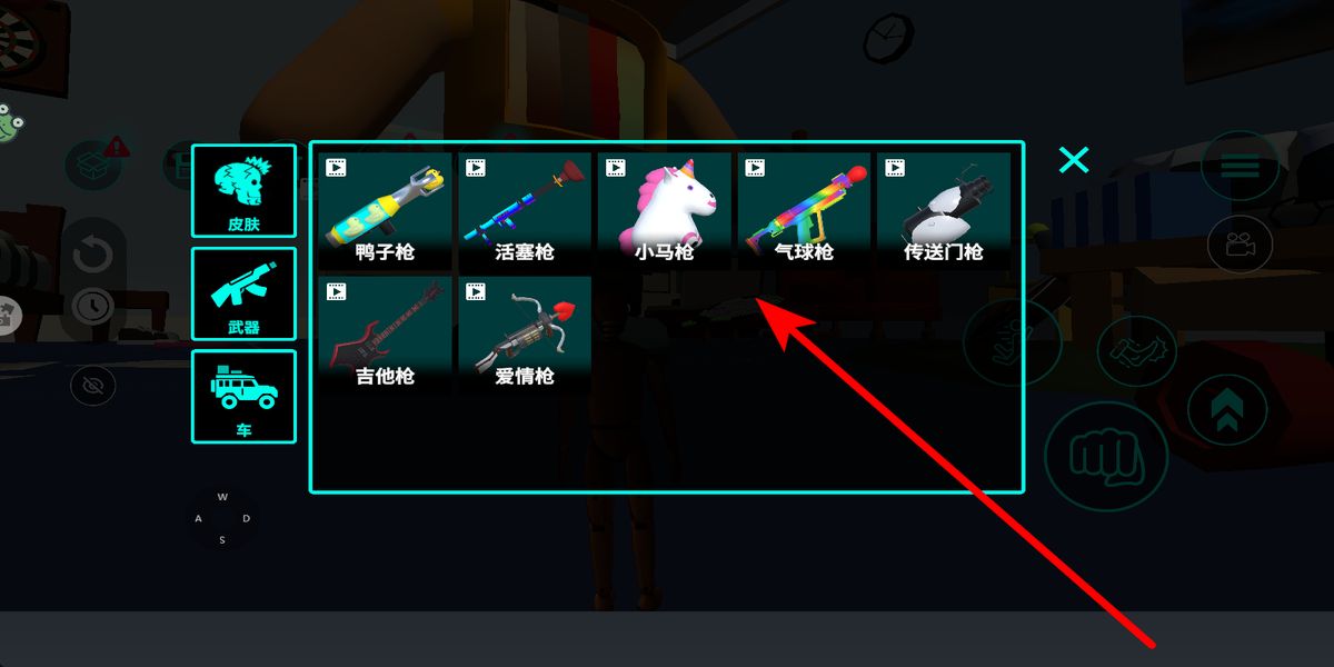 2、找到武器選擇區(qū)域,這里有鴨子槍、活塞槍、小馬槍等各類(lèi)特色武器,從中挑選想要使用的武器,為后續(xù)在場(chǎng)景內(nèi)的操作做好準(zhǔn)備。