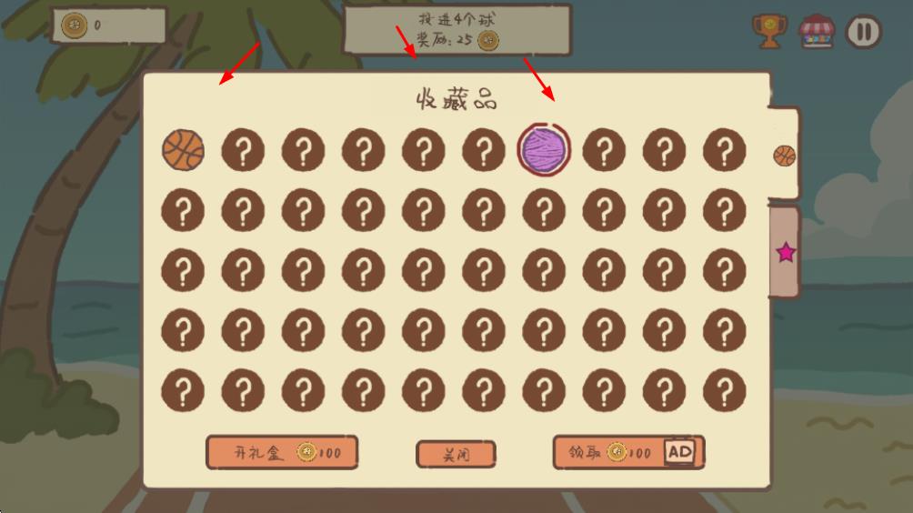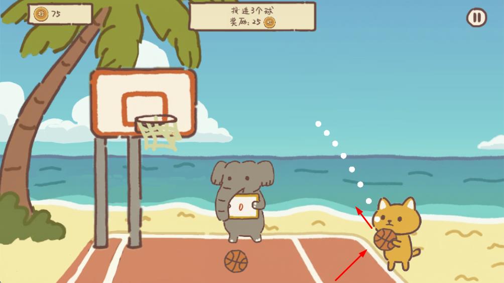 1、在海灘籃球場場景中,操控小動物投籃,瞄準(zhǔn)籃筐投擲籃球,嘗試達(dá)成投進3個球等目標(biāo),獲取25金幣等獎勵。