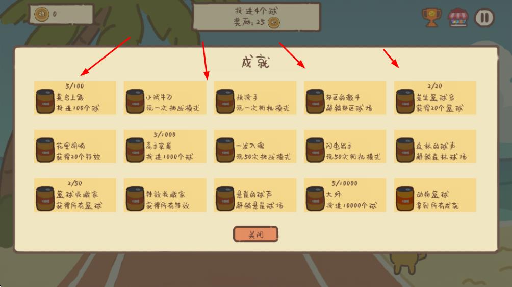 3、參與投籃挑戰(zhàn),完成投進100個球玩一次挑戰(zhàn)模式等成就任務(wù),解鎖菜鳥上路小試牛刀等成就,提升游戲進度。