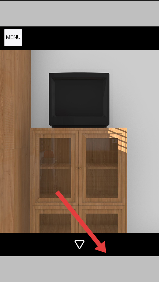 1、畫面呈現(xiàn)帶有木質柜子與老式黑色電視機的場景,左上角有按鈕,下方有向下的三角形標識,可留意這些界面元素。