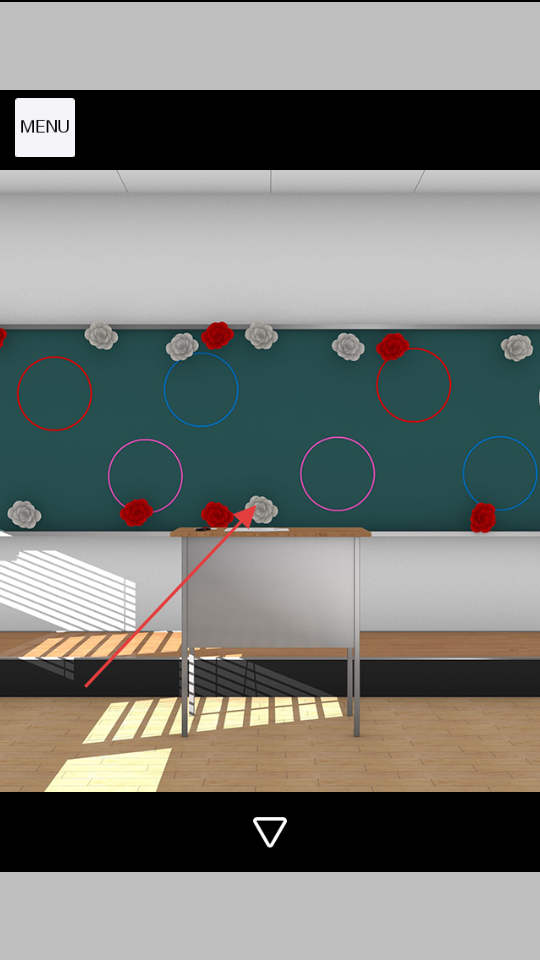 3、呈現(xiàn)帶有裝飾花朵和彩色圓圈的綠色的墻面,以及前方桌子的場景,下方有向下標識,可留意墻面的裝飾等元素。