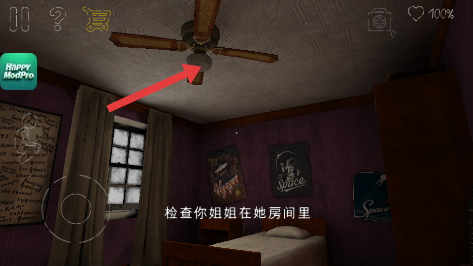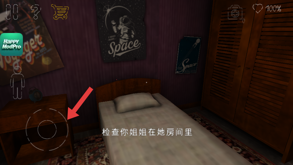 1、畫面呈現(xiàn)房間場(chǎng)景,海報(bào)、衣柜等元素,文字提示檢查你姐姐在她房間里,可在該房間內(nèi)探索相關(guān)線索。