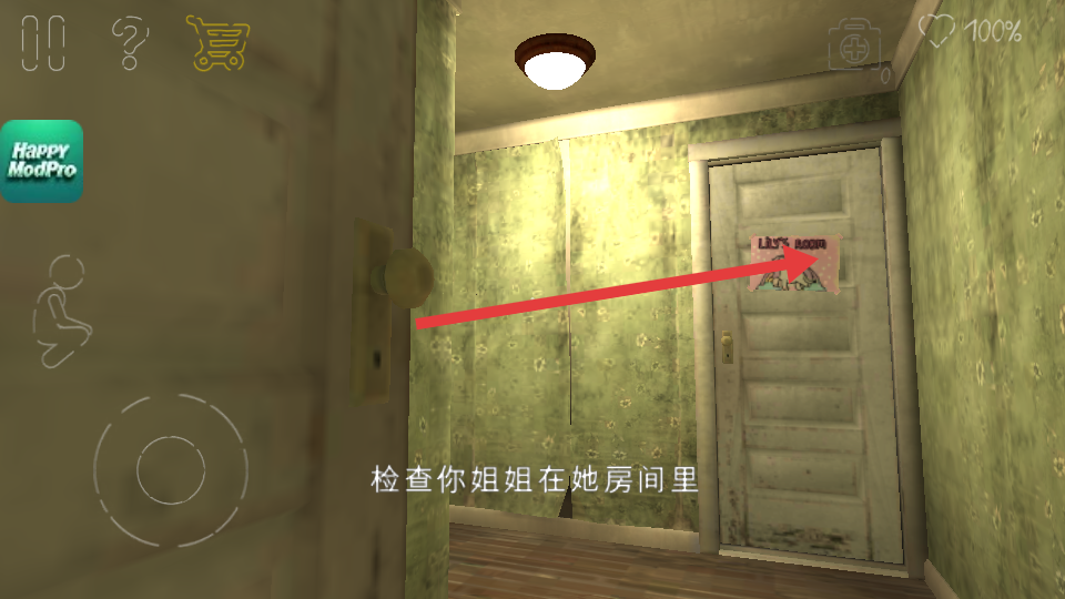 2、展示中帶有標(biāo)有Lily's room房門的走廊場(chǎng)景,需要仔細(xì)的查看文字提示,可前往該房間來開展任務(wù)。