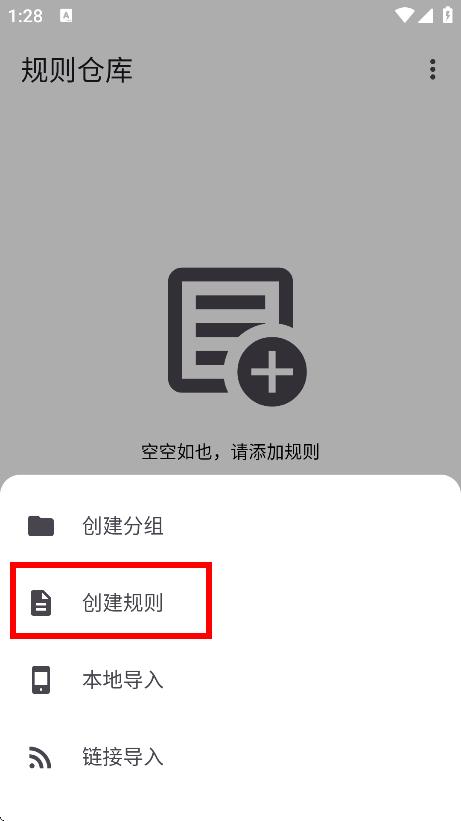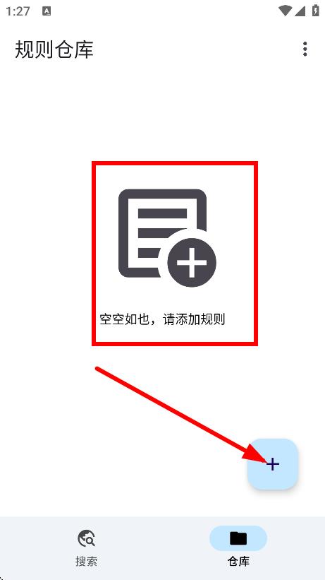 2、在規(guī)則倉庫頁面,點(diǎn)擊右下角+號(hào)按鈕,展開添加規(guī)則選項(xiàng)。