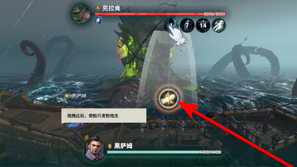 1、首先要指揮射擊,在遭遇敵人如克拉肯時,按照提示拖拽相應(yīng)位置,使船只發(fā)射炮擊,以此對敵人造成傷害,開啟戰(zhàn)斗環(huán)節(jié),應(yīng)對航海中的威脅。