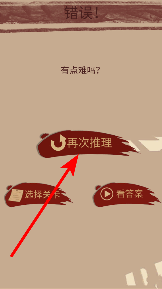 4、最后進(jìn)行推理嘗試,若推理錯(cuò)誤,會(huì)出現(xiàn)提示界面,此時(shí)可選擇再次推理,重新梳理線索,再次嘗試找出真相,不斷接近案件的答案。