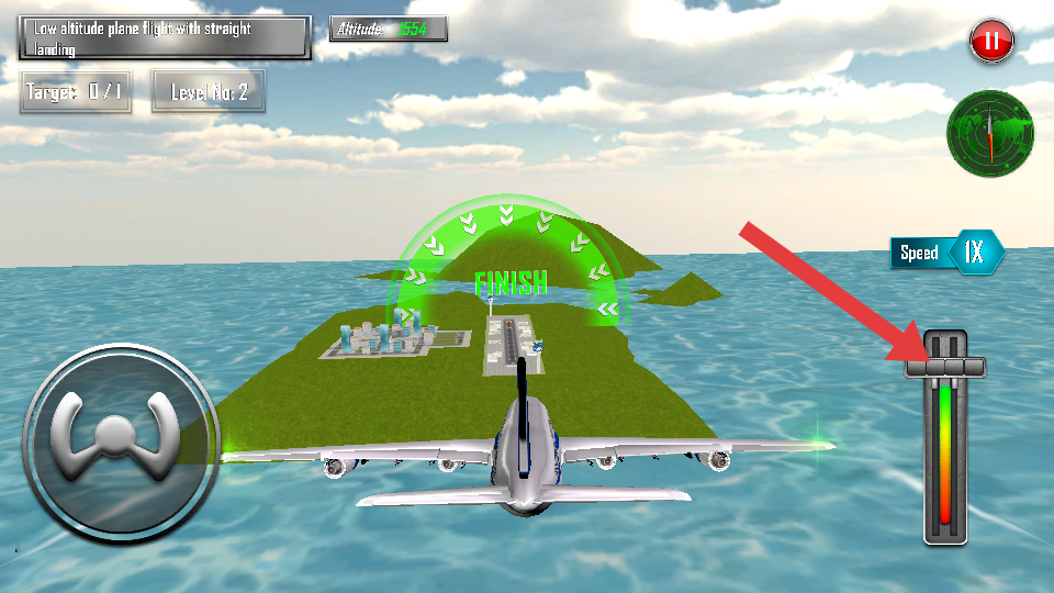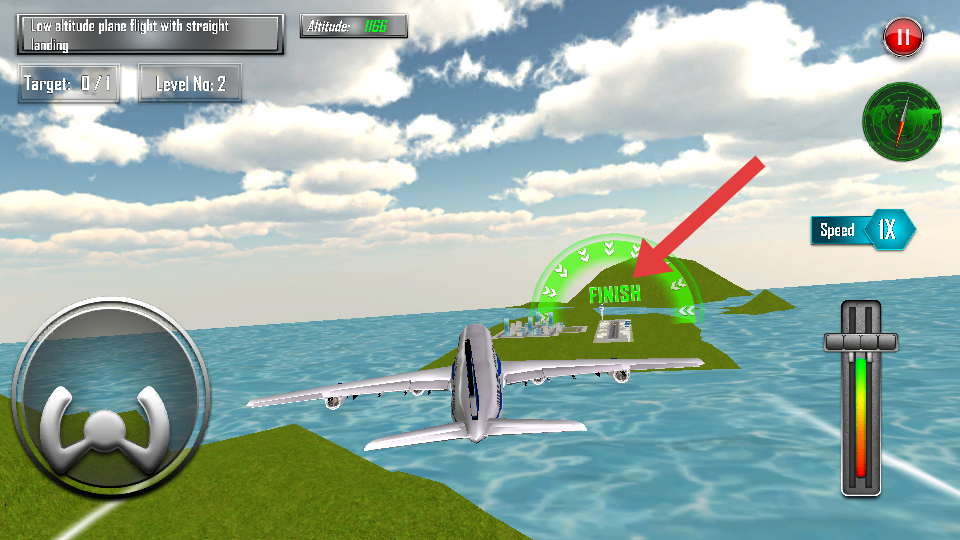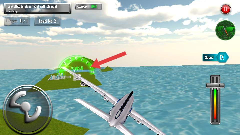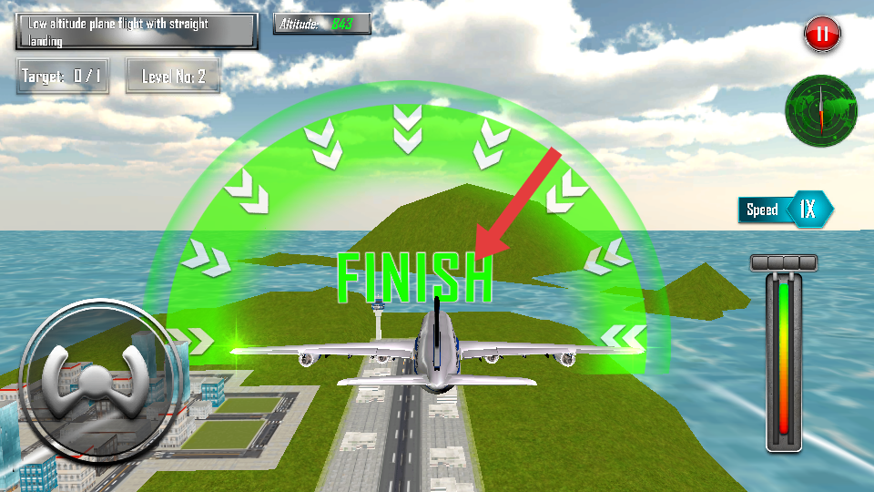 1、提前鎖定目標,飛行中留意FINISH標識的降落區(qū)域,通過航向儀調(diào)整方向,確保飛機始終對準降落區(qū)域的中線,避免航線偏移。