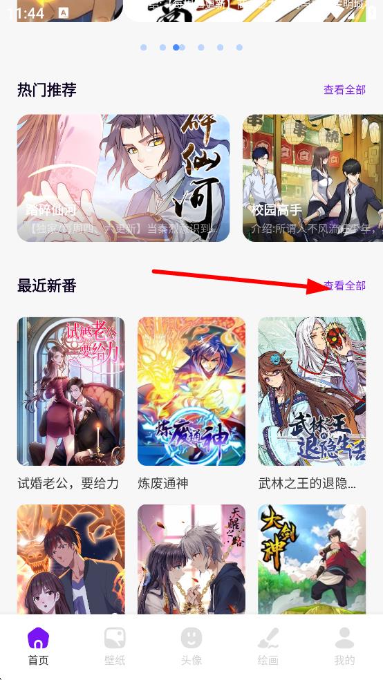 2、進(jìn)入首頁后,點(diǎn)擊最近新番旁的查看全部,進(jìn)入最近新番列表。