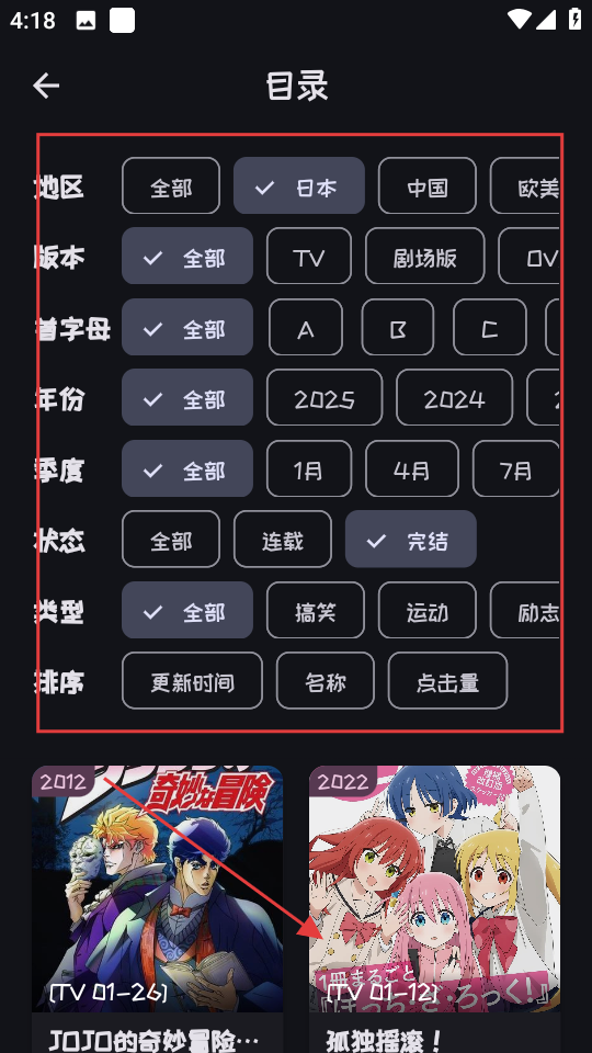 2、在目錄頁面,篩選條件找到想看的動漫,進入該劇集頁面。