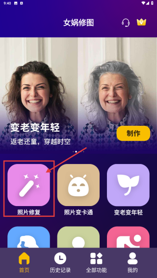 1、打開(kāi)女?huà)z修圖應(yīng)用,點(diǎn)擊照片修復(fù)功能選項(xiàng),進(jìn)入照片修復(fù)流程。