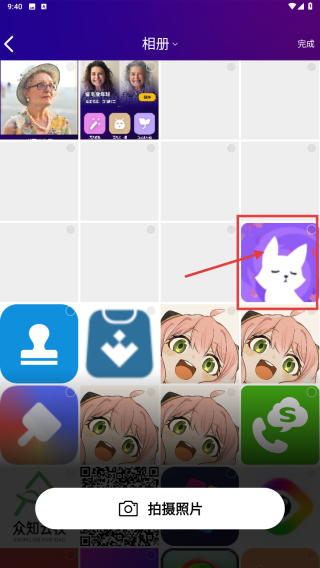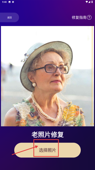 2、在照片修復(fù)頁(yè)面,點(diǎn)擊選擇照片按鈕,打開(kāi)相冊(cè)選擇界面。