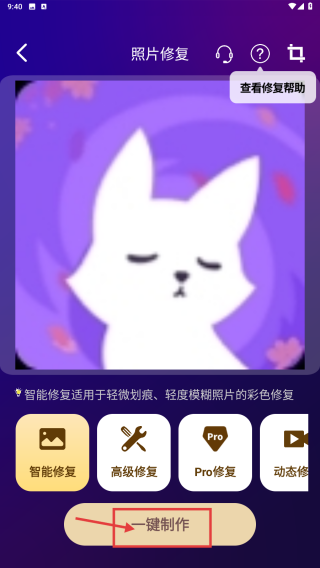4、在照片修復(fù)頁(yè)面,點(diǎn)擊一鍵制作按鈕,完成圖片修復(fù)操作。