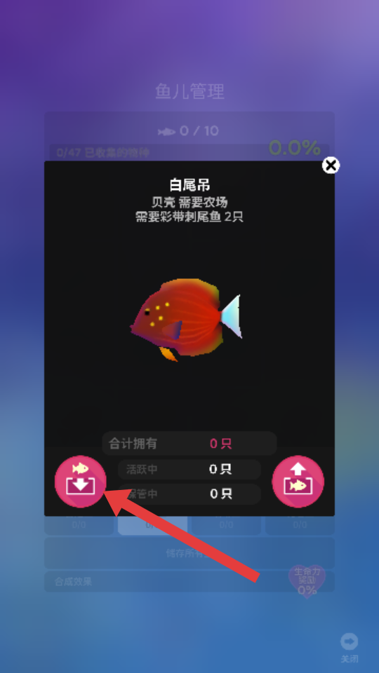 2、關注每種合成魚的具體合成條件,需要彩帶刺尾魚2只,所以要針對性地去漁場,捕捉或通過其他途徑獲得彩帶刺尾魚。