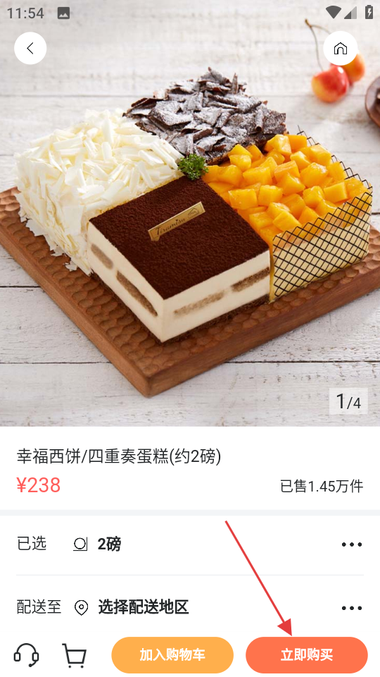 3、在蛋糕詳情頁面,點擊立即購買,進入配送地址選擇頁面。
