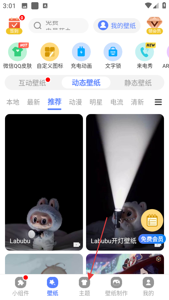 1、打開(kāi)心動(dòng)主題壁紙,點(diǎn)擊底部導(dǎo)航欄的主題。