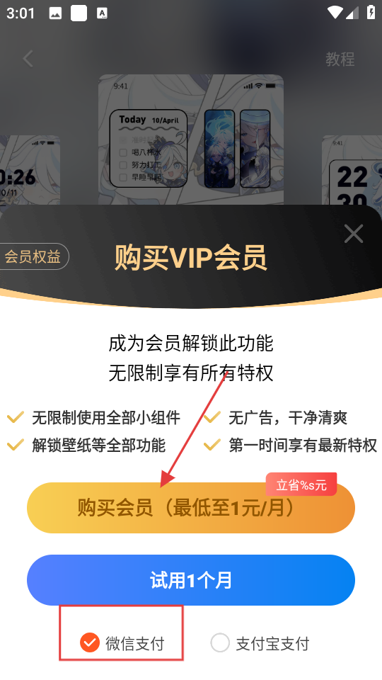 4、在購(gòu)買(mǎi)VIP會(huì)員頁(yè)面,選擇購(gòu)買(mǎi)會(huì)員,完成購(gòu)買(mǎi)后即可繼續(xù)設(shè)置主題。
