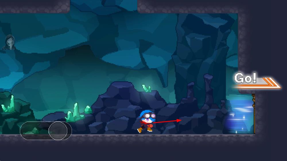 1、進(jìn)入洞穴場(chǎng)景后,跟隨Go!提示操控角色向右移動(dòng),探索布滿發(fā)光晶體的洞穴區(qū)域。