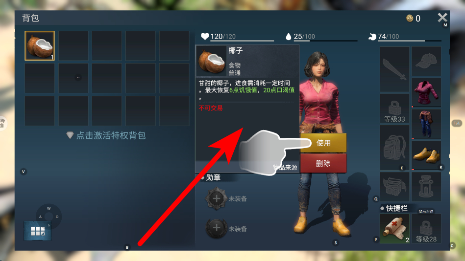 4、進(jìn)入背包界面,當(dāng)需要補(bǔ)充體力或滿足其他需求時,選擇相應(yīng)的物品,如椰子,點擊使用,發(fā)揮物品的作用,保障角色生存。