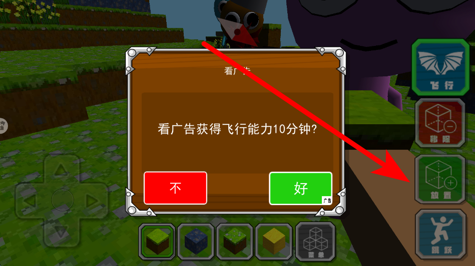 4、獲取特殊能力,若想獲得飛行等特殊能力,可選擇觀看廣告,以此獲得相應(yīng)的特殊能力,助力在方塊世界中更便捷地探索。