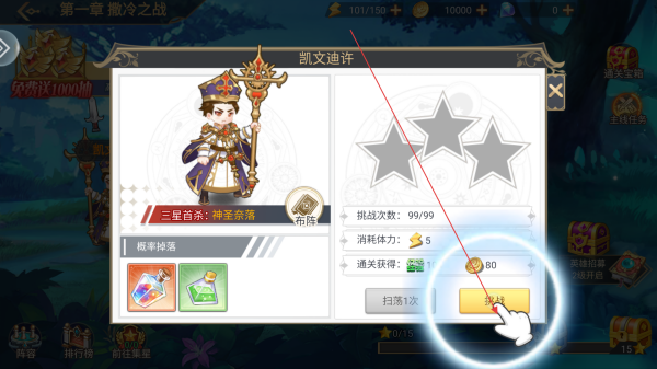 2、點擊關(guān)卡中的敵人角色,如凱文迪許,查看挑戰(zhàn)信息,確認消耗體力和通關(guān)獲得的獎勵后,點擊挑戰(zhàn)按鈕開啟戰(zhàn)斗。