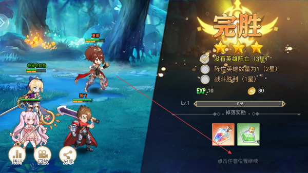 4、戰(zhàn)斗結(jié)束后,查看戰(zhàn)斗評價和掉落獎勵,點擊任意位置繼續(xù)游戲,利用獲得的資源培養(yǎng)英雄,挑戰(zhàn)后續(xù)關(guān)卡。
