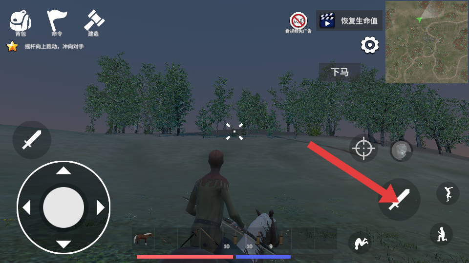 1、先靠近場景中的馬匹,點擊騎乘按鈕解鎖騎馬功能,騎馬狀態(tài)下可大幅提升移動速度,更高效地在村莊與城市之間穿梭。