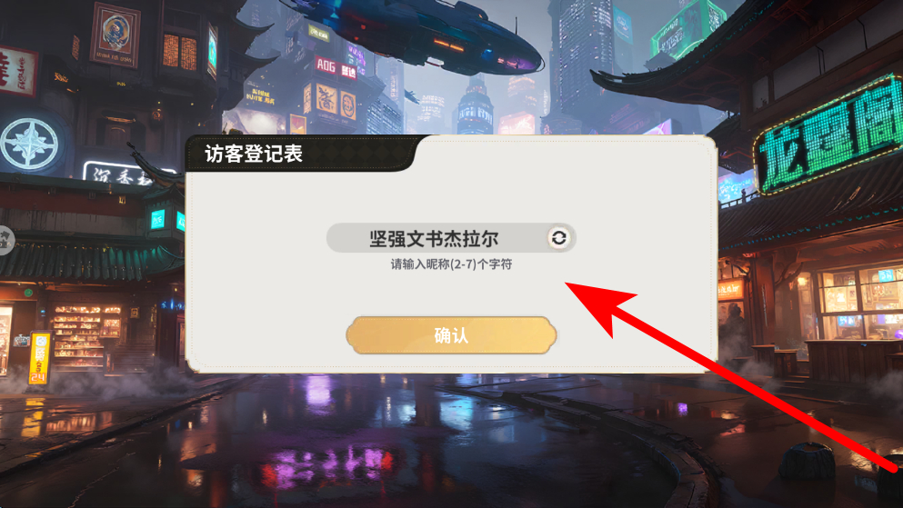 1、首先進(jìn)行角色創(chuàng)建昵稱(chēng)設(shè)定,找到輸入昵稱(chēng)的區(qū)域,按照提示輸入2到7個(gè)字符的昵稱(chēng),然后點(diǎn)擊確認(rèn)按鈕,完成昵稱(chēng)設(shè)定,開(kāi)啟游戲旅程。