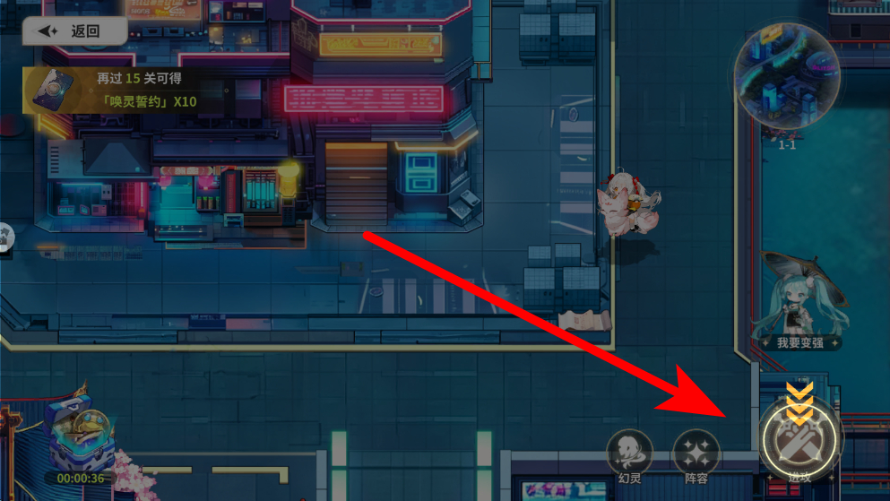 2、能看到場(chǎng)景內(nèi)的建筑與進(jìn)攻提示,界面下方有幻靈陣容進(jìn)攻等功能圖標(biāo),點(diǎn)擊這些圖標(biāo)可查看或調(diào)整幻靈、陣容等戰(zhàn)斗相關(guān)設(shè)置,為戰(zhàn)斗做準(zhǔn)備。