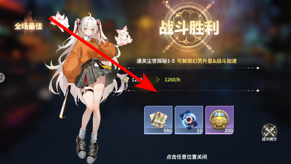 4、最后獲取勝利獎(jiǎng)勵(lì),戰(zhàn)斗勝利后,會(huì)顯示戰(zhàn)斗勝利界面,同時(shí)能獲得各類(lèi)獎(jiǎng)勵(lì),如特定數(shù)量的道具等,點(diǎn)擊任意位置可關(guān)閉該界面,繼續(xù)后續(xù)內(nèi)容。