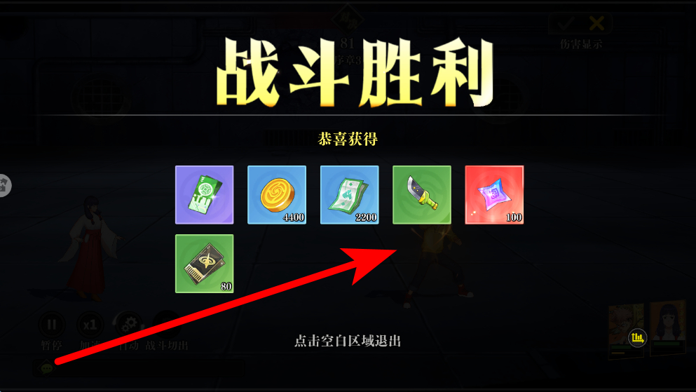 4、成功擊敗敵人后,會顯示戰(zhàn)斗勝利界面,同時可獲得多種獎勵,如不同數(shù)量的貨幣、道具等,點擊空白區(qū)域可退出該界面,繼續(xù)后續(xù)游戲內容。
