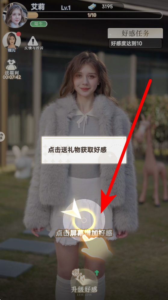 1、與角色互動(dòng)界面,可點(diǎn)擊屏幕增加好感,也能點(diǎn)擊送禮物來(lái)獲取好感,通過(guò)這些方式逐步提升與角色的好感度,開(kāi)啟更多互動(dòng)可能。