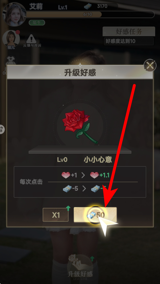 2、當(dāng)有足夠資源時(shí),進(jìn)入升級(jí)好感界面,消耗相應(yīng)物品或資金,對(duì)好感進(jìn)行升級(jí),升級(jí)后每次互動(dòng)增加的好感度會(huì)得到提升,讓好感培養(yǎng)更高效。
